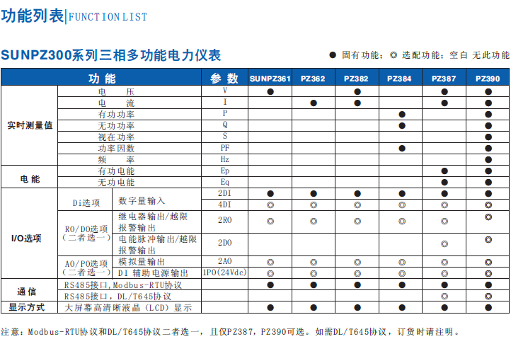 SUNPZ300 系列多功能电力分析仪表根据不同功能共有如下型号:
