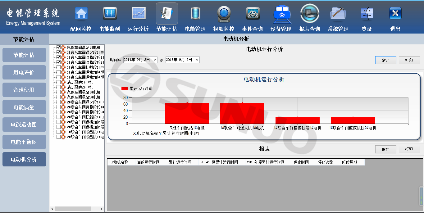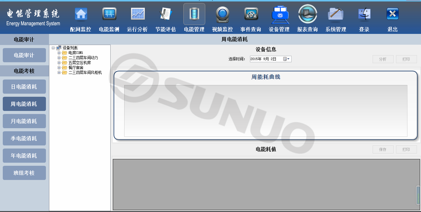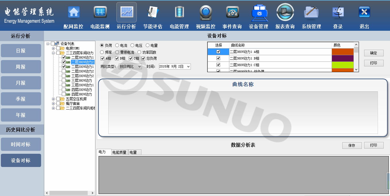 为电能管理人员提供监控点日、周、月、季、年电能分析报告,报告对电能的指标以曲线、表格的形式展示,并从电力、电能质量和电量三个方面进行数据对照,指导电能管理人员分析配电网络的运行情况。